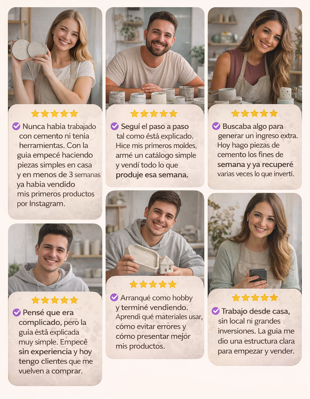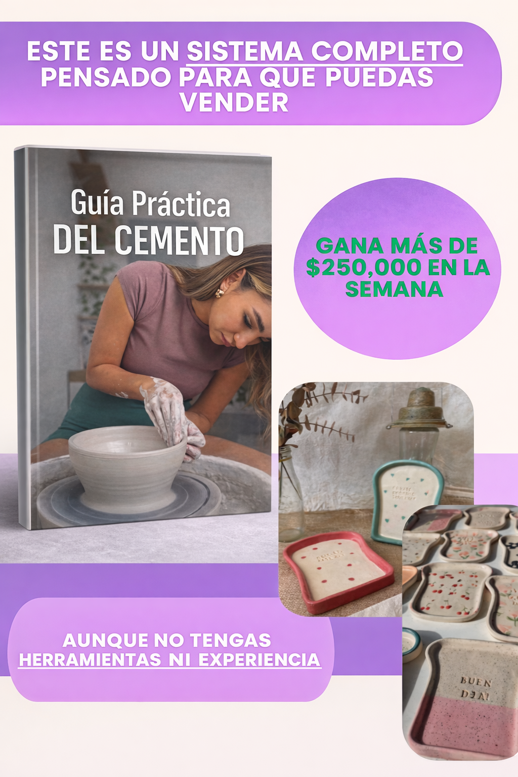 El contenido está pensado como un sistema práctico, enfocado en que puedas producir piezas de cemento y comercializarlas, incluso desde tu casa.