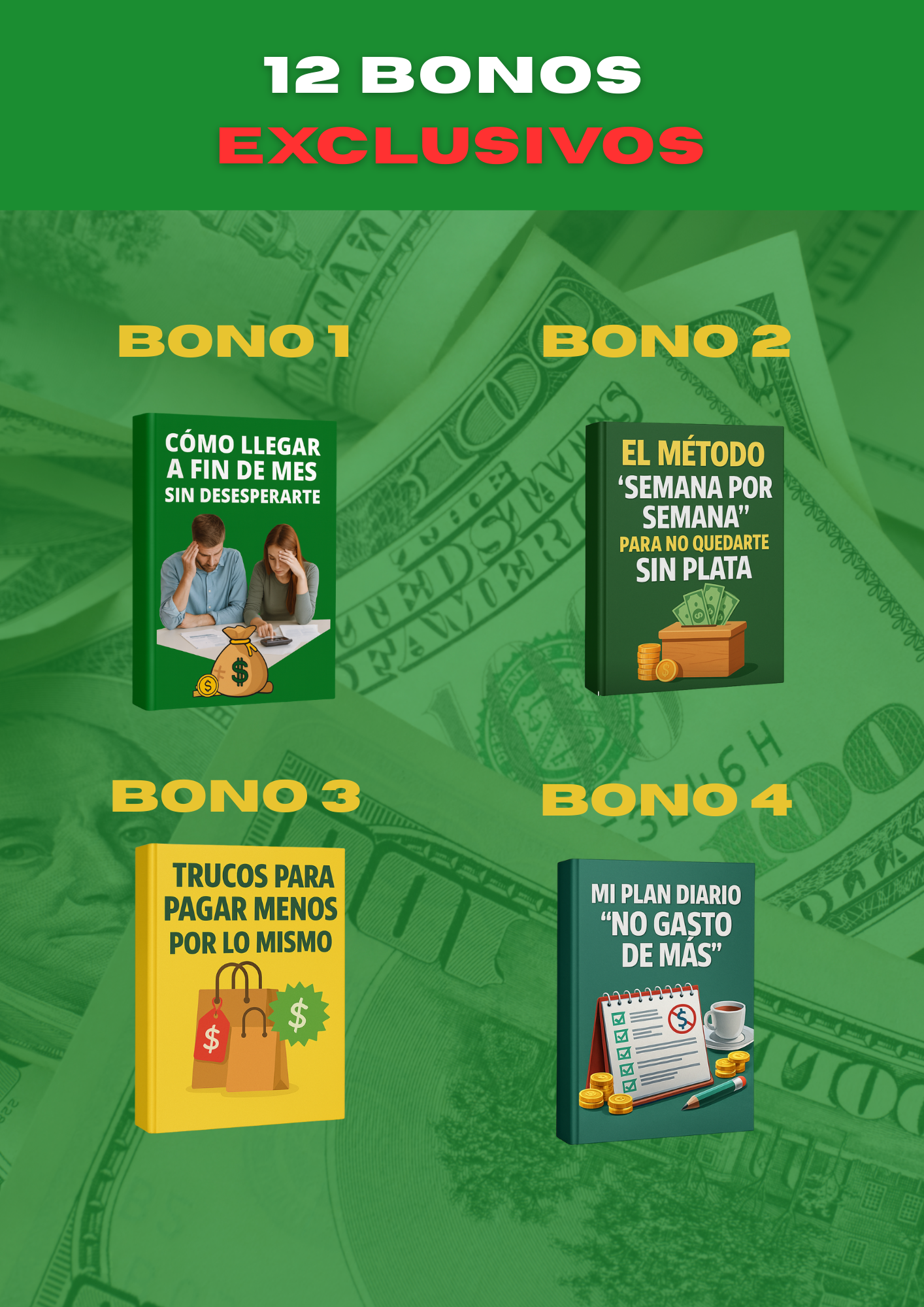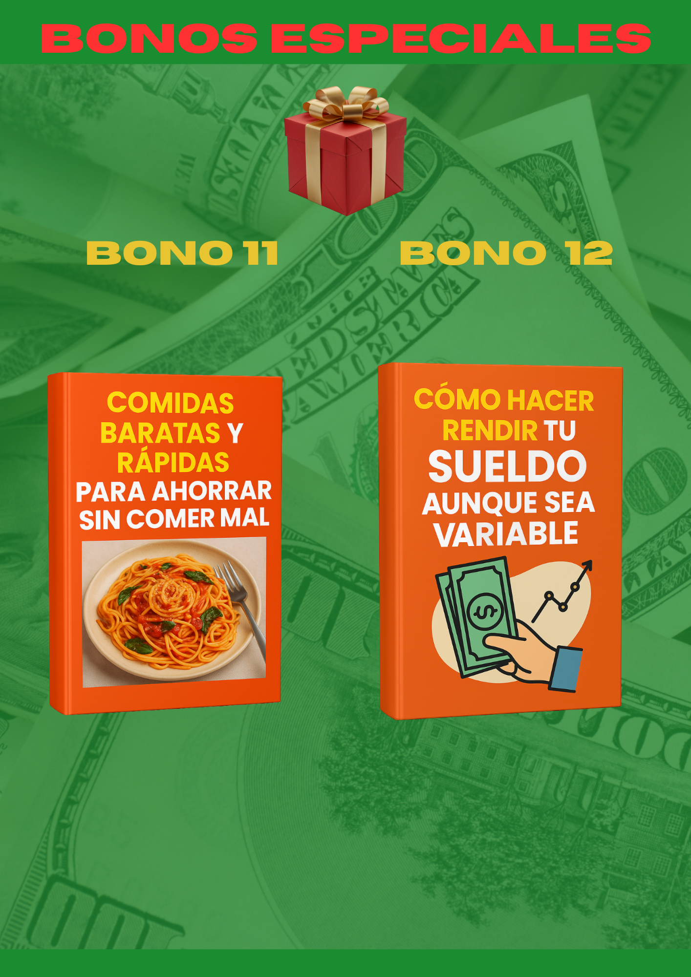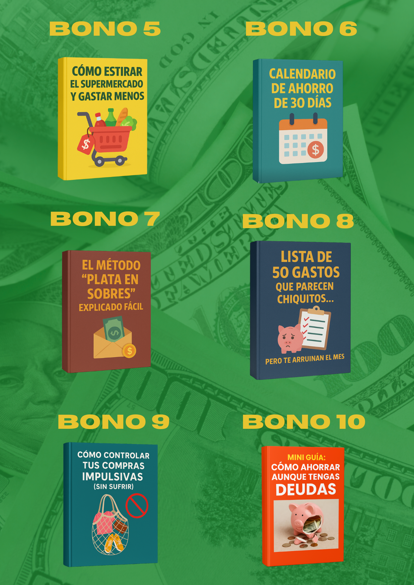 Incluye el ebook principal “Cómo ahorrar dinero aunque ganes poco” + 12 bonos exclusivos que complementan la lectura y te ayudan a aplicar cada paso en la vida real.
